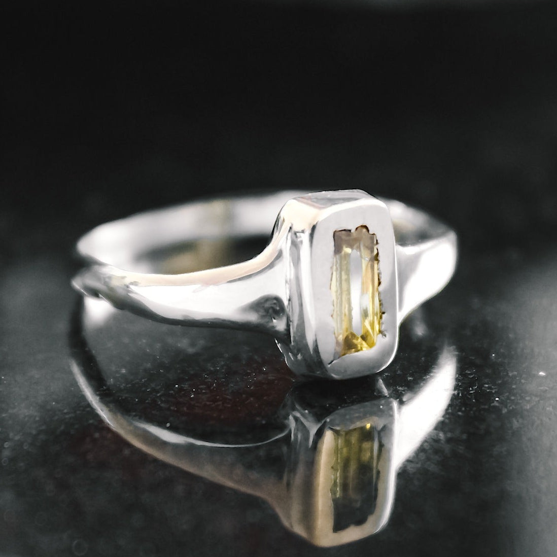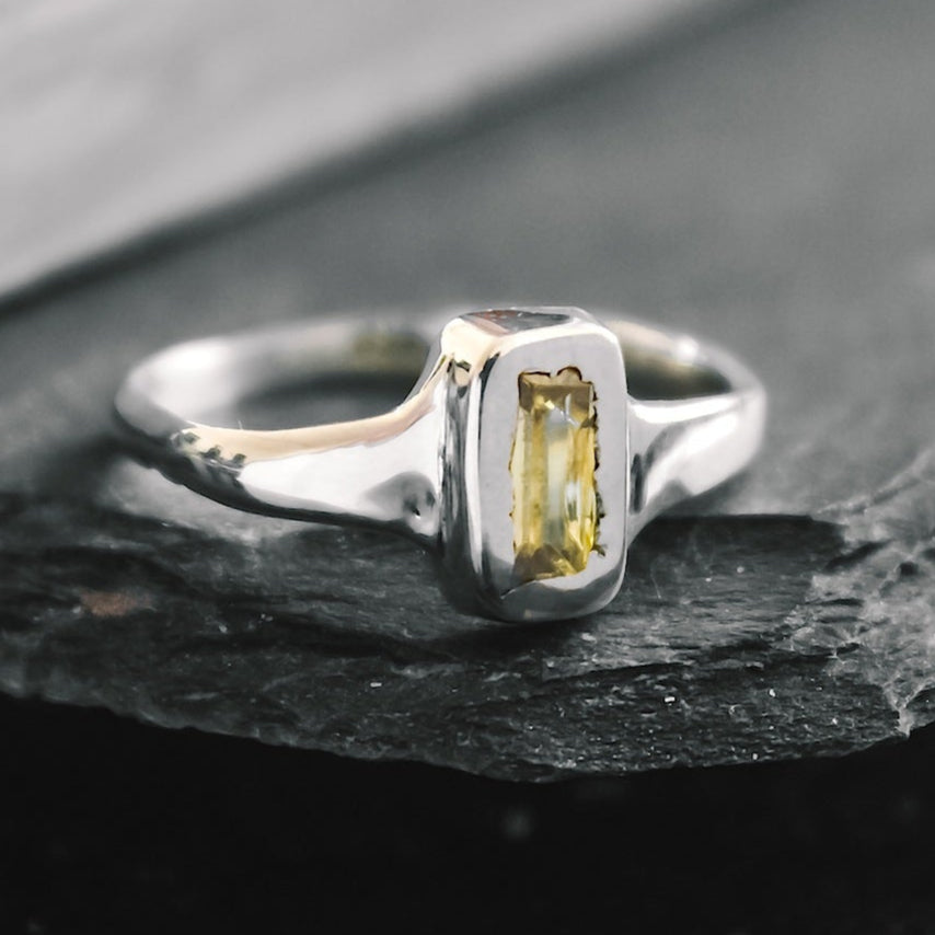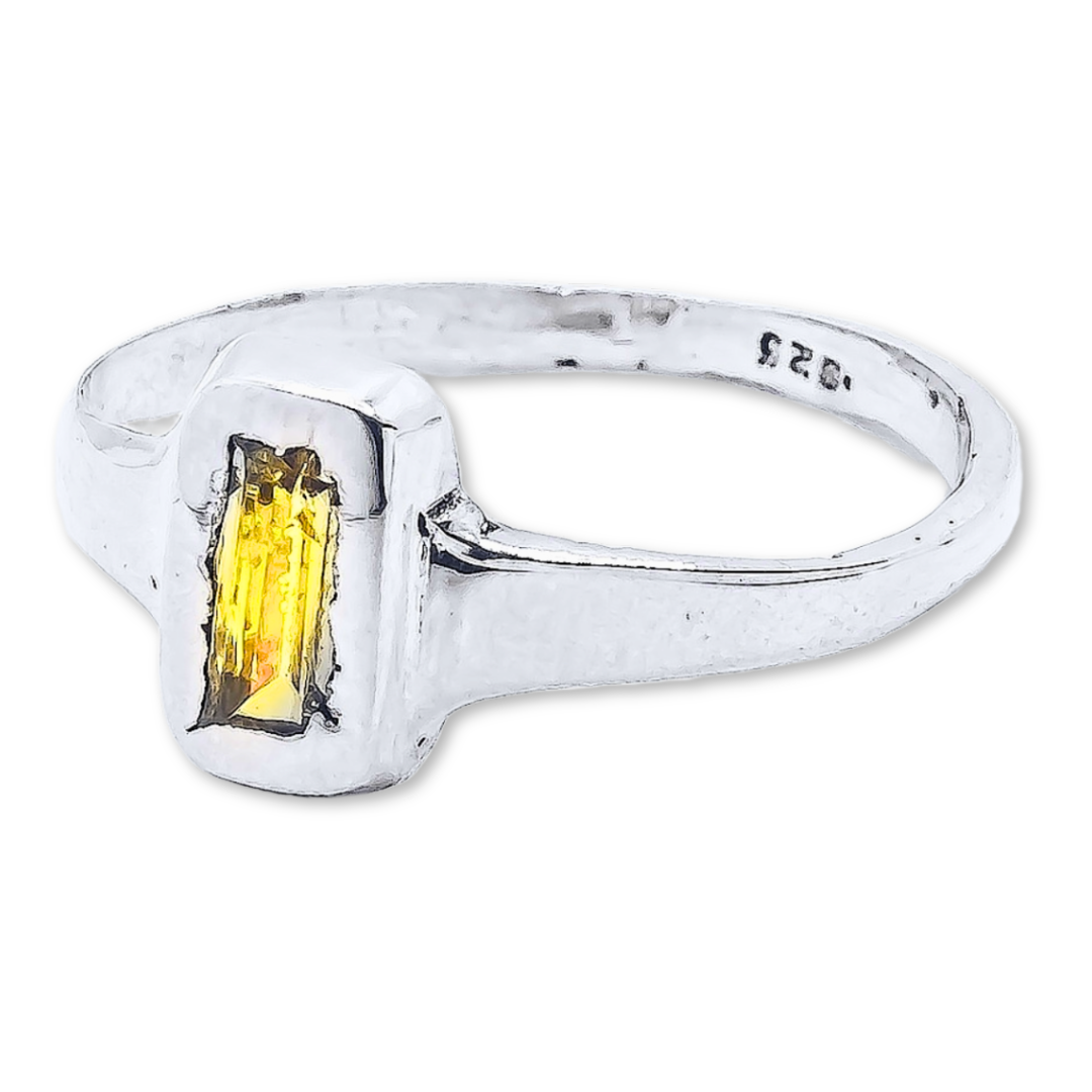 This refined piece features a slim, polished band that supports a clean-cut rectangular face, beautifully set with a radiant yellow gemstone. The warm hue of the stone contrasts effortlessly with the cool tones of the silver, offering a modern twist on a classic silhouette.