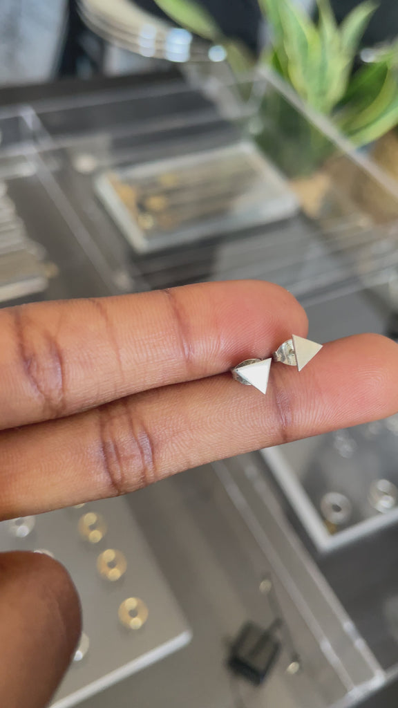 A simple set of earrings can be styled with practically any outfit. These beautifully hand-cut sterling silver studs in triangle form, will help elevate a casual look! Such perfect studs like these will sit snugly on the earlobe, suitable for any activity, so do not worry about losing them! Mix and match with the Quadrate Square or Cyclical Circle Studs! Handcrafted and made from 100% recycled silver. Mirror finish.